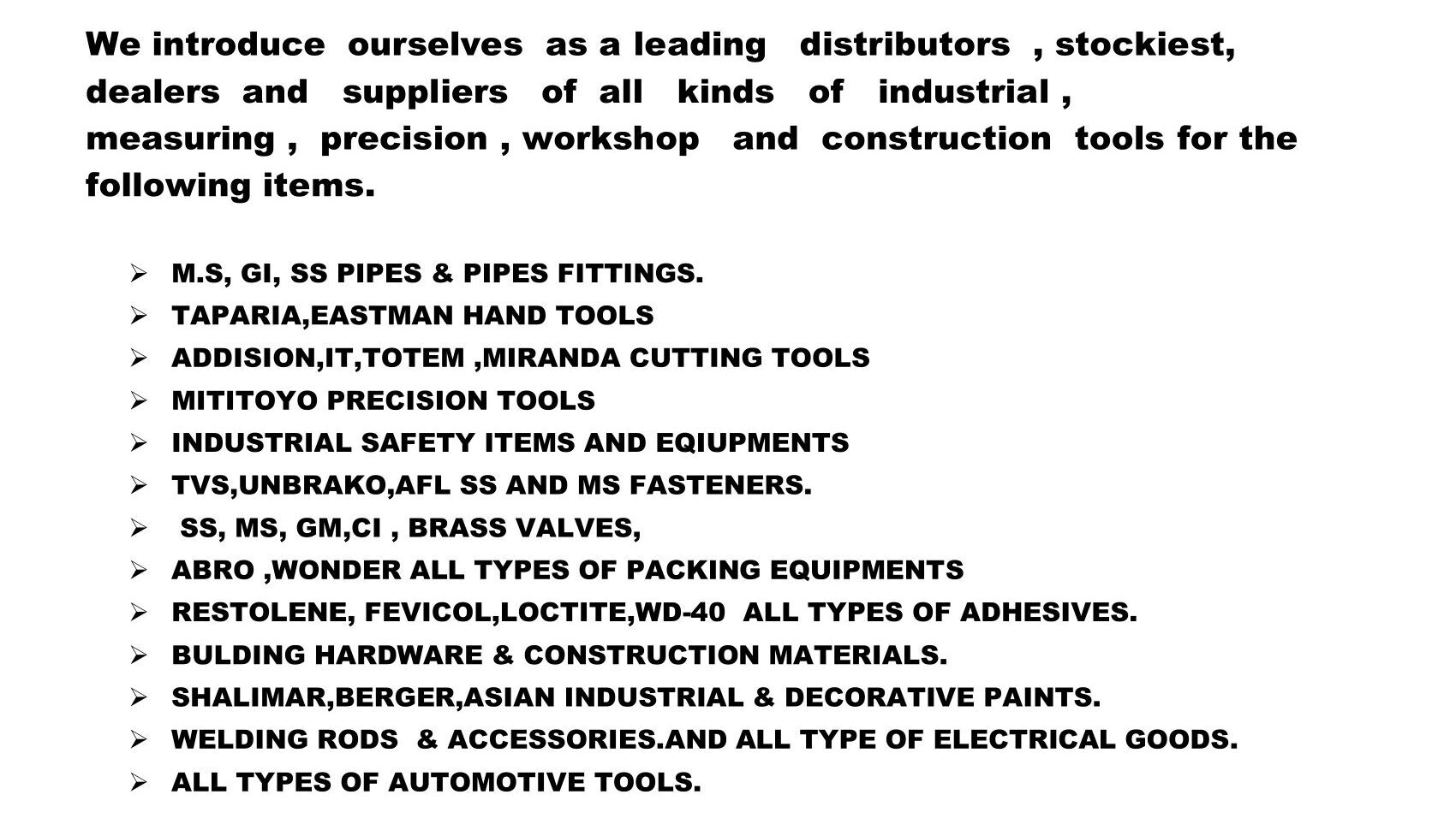 Brands : VS, Bharat, Supreme, Astral, Finolex, Aashirvaad etc