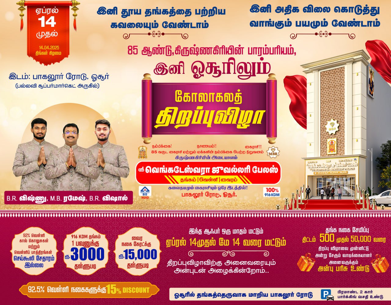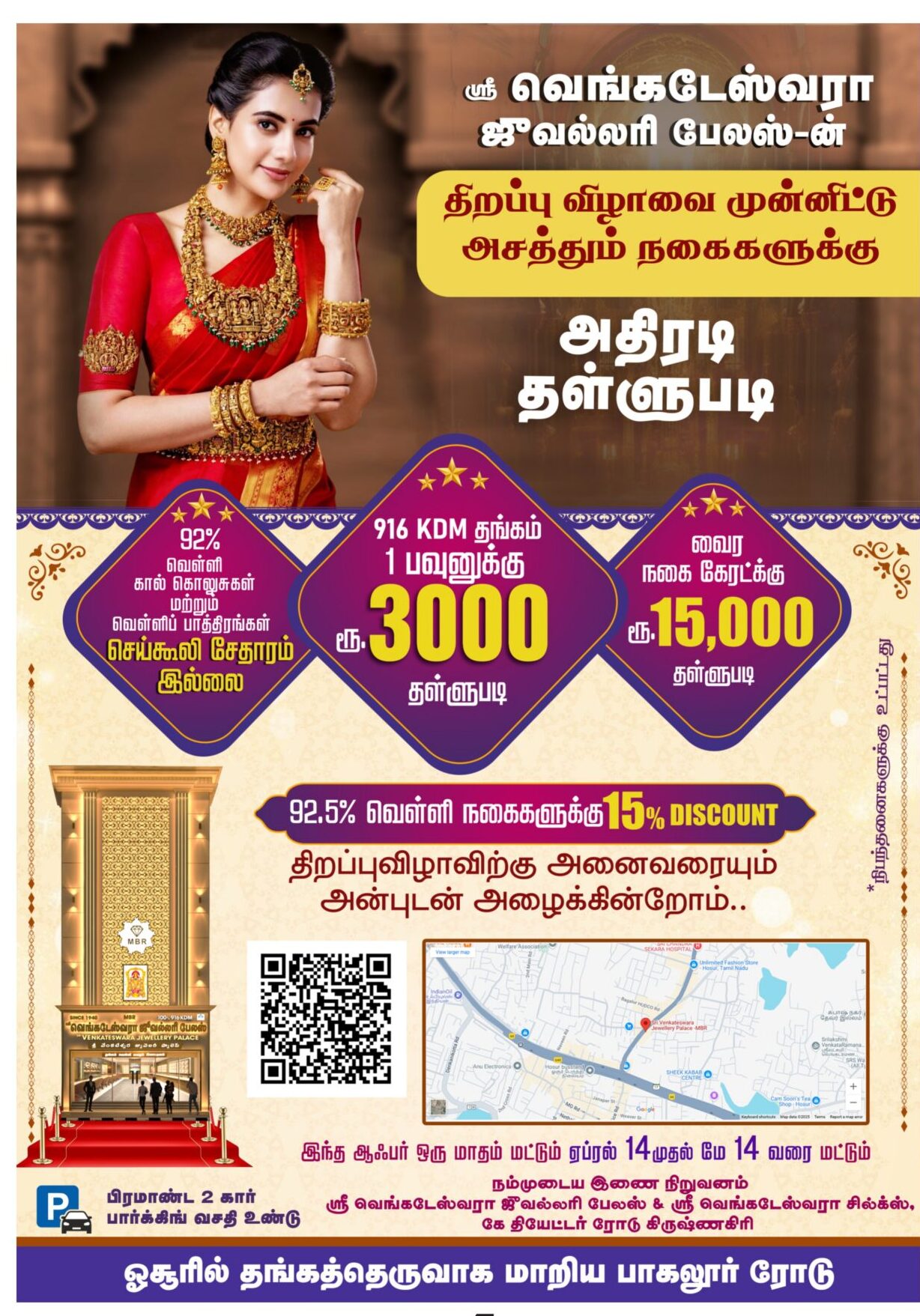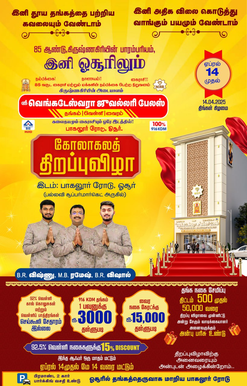 Sri Venkateswara Jewellery Palace -MBR Hosur, Tamilnadu Sri Venkateswara Jewellery 9514339696 Save Contact Phone-alt Whatsapp Envelope Map-marked-alt Facebook Phone-alt Whatsapp Envelope Map-marker-alt 9514339696 9514339696 @gmail.com 74/P3, Bagalur Rd, Hosur, Tamil Nadu 635109 Profile Impressions Total Views Click here to Share Send Opening Soon In Hosur Share